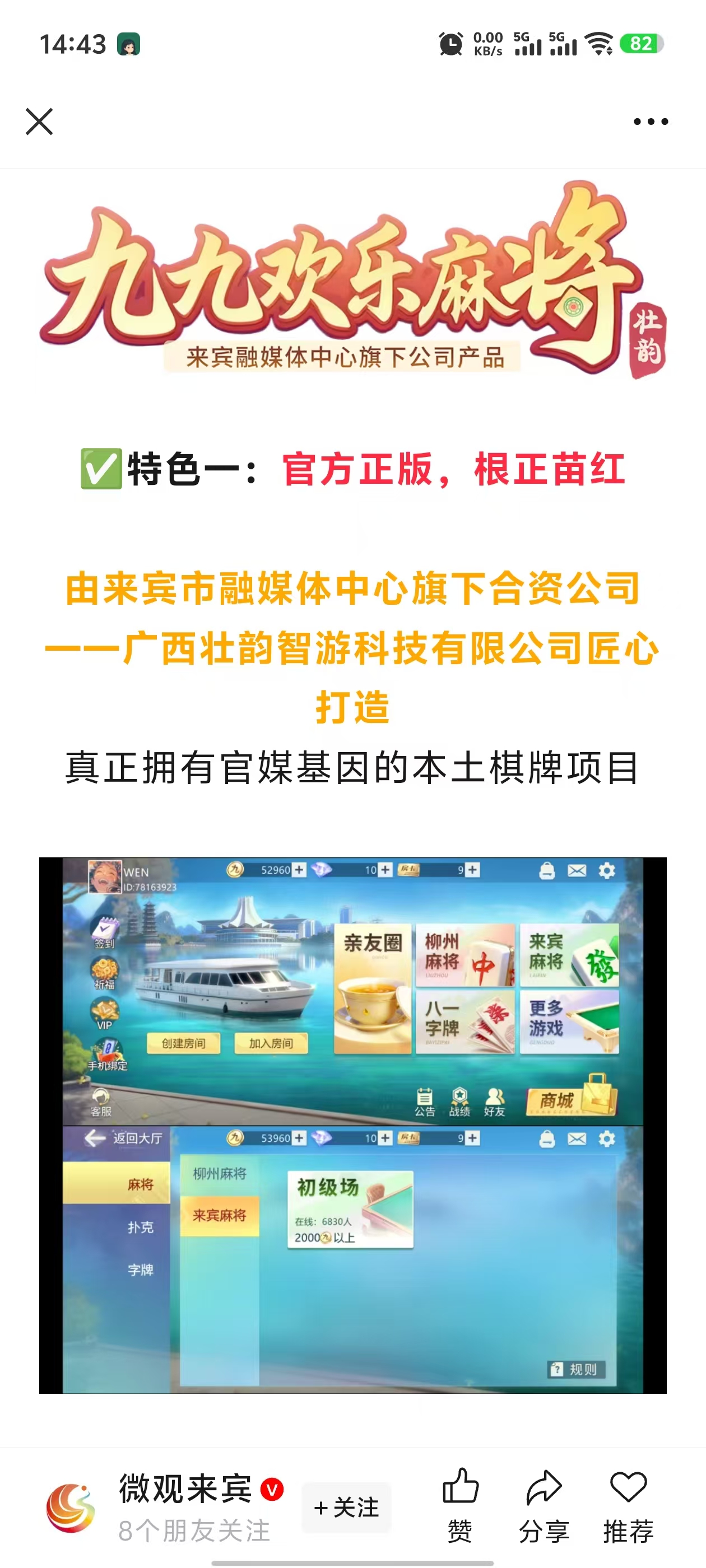 广西壮韵智游网络科技有限公司,地址位于,广西壮族自治区来宾市兴宾区桂中大道东568号来宾市融媒体中心(来宾市融媒体中心主楼13楼1311号),主营垂直棋牌的研发,运营和推广。核心成员均为资深研发、管理经验的行业精英。成立至今,秉持产品为王的理念,和用户在一起,坚持长线和精细化运营,为玩家打造超预期的精品娱乐休闲体验,并依靠稳固良好的运营渠道拥抱用户,渗透市场,即将迎来业绩爆发期。